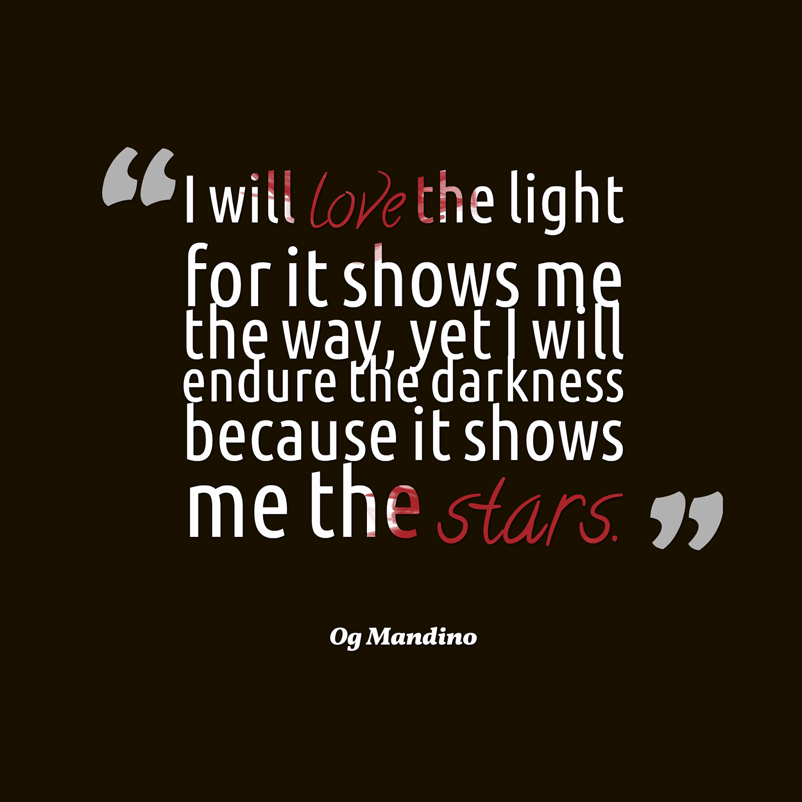I will love the light for it shows me the way, yet I will endure the darkness because it shows me the stars. - Og Mandino