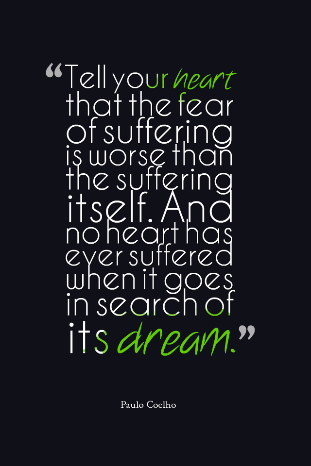 Tell your heart that the fear of suffering is worse than the suffering itself. And no heart has ever suffered when it goes in search of its dream. - Paulo Coelho